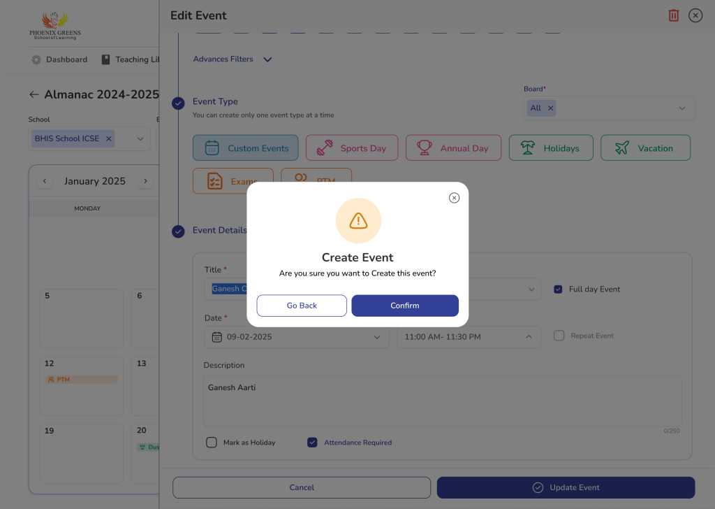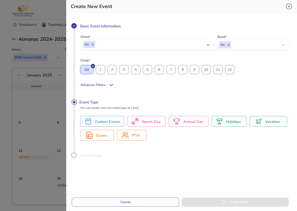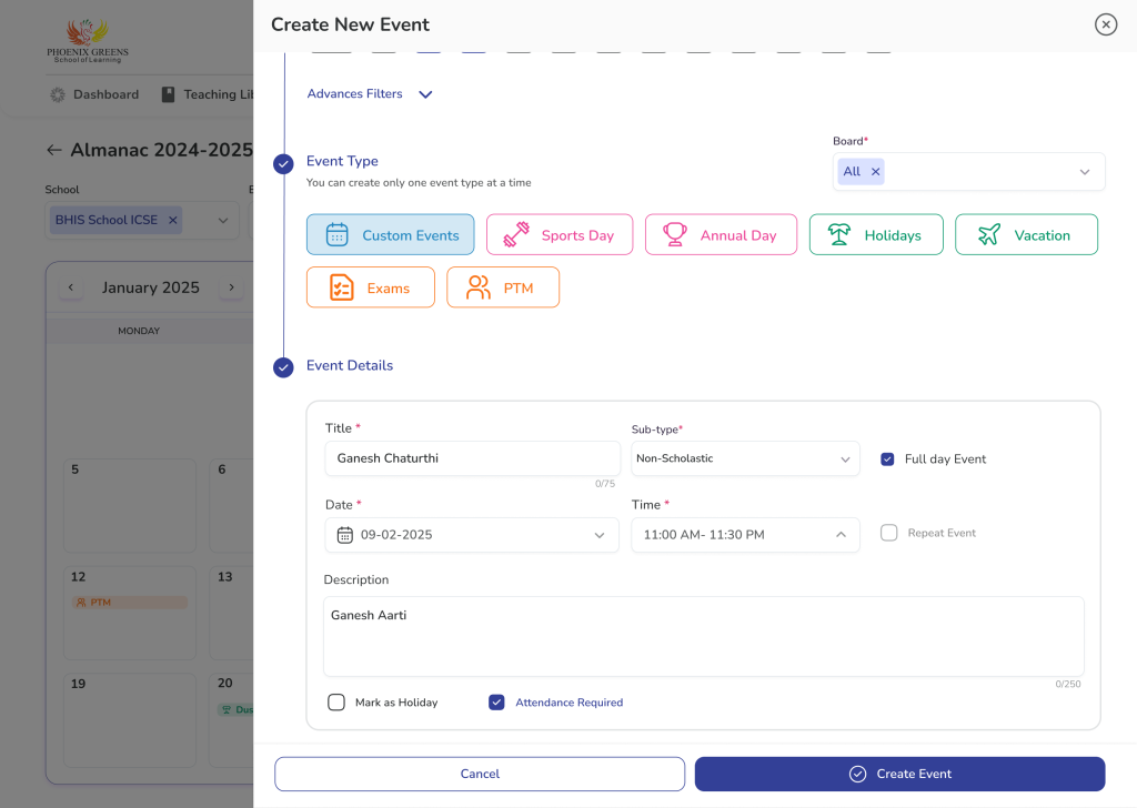 - Event Type Selection (Custom / Sports Day, Annual Day, Holidays, Vacations, Exams, PTM)