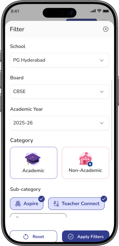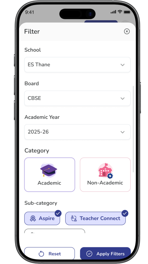✅ Tip: Use School, Board, and Academic Year first, then apply Category and Sub-category filters for better results.