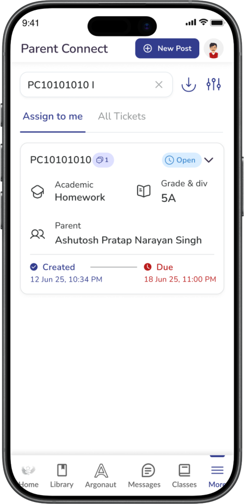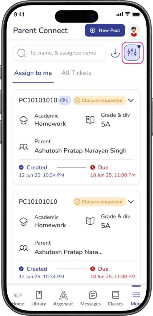 You can search using details such as ticket ID, parent name, or assignee name.
