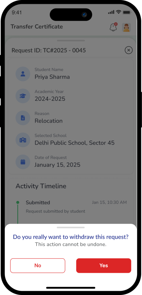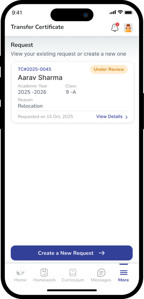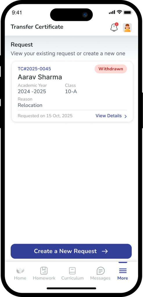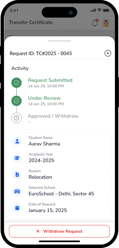 To stay informed on a student’s withdrawal progress, parents can easily track an existing Transfer Certificate (TC) request through the dedicated module in the school app. Upon logging in and navigating to the student’s profile, the system displays a “Request Card” that acts as a real-time status tracker for any active submission. This card provides essential visibility into the administrative workflow, highlighting key stages such as Under Review, Reconsider (awaiting further parent-school discussion), Approved (clearances complete), or Withdrawn (request cancelled). By centralizing this information, it eliminates the need for manual follow-ups, ensuring that families can monitor everything from the initial reason for withdrawal to the final issuance of the certificate in one transparent location.