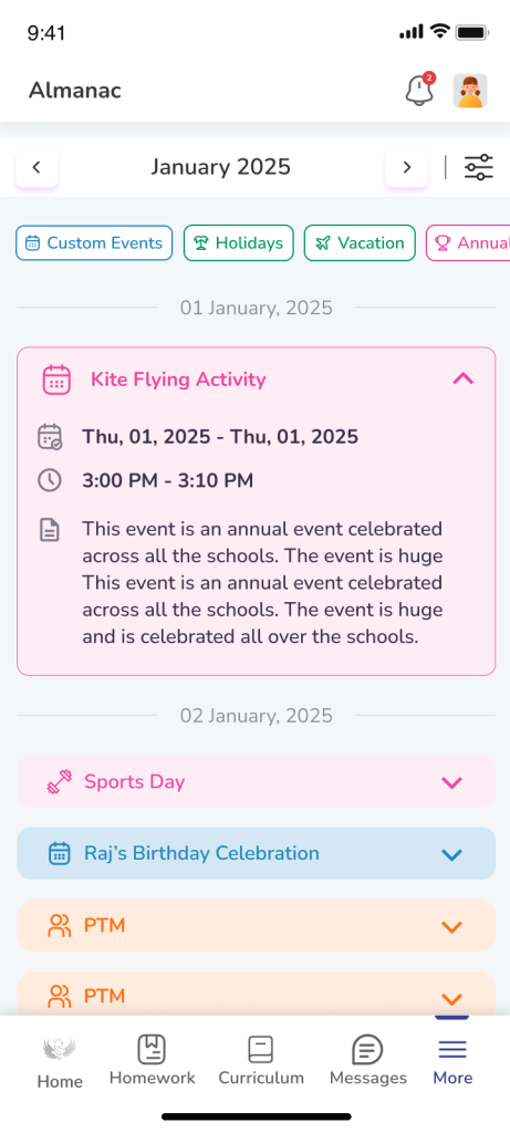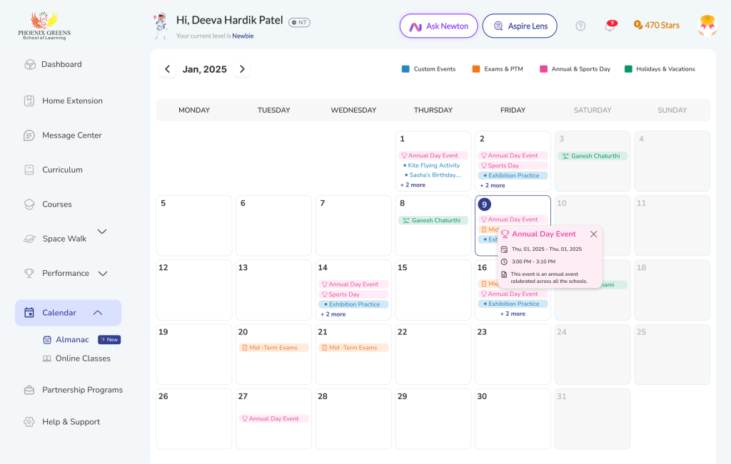 Almanac is the centralized academic calendar module within the K-12 LMS. It provides a structured and reliable source of information for all school-related events, including academic activities, examinations, holidays, vacations, and institutional events.