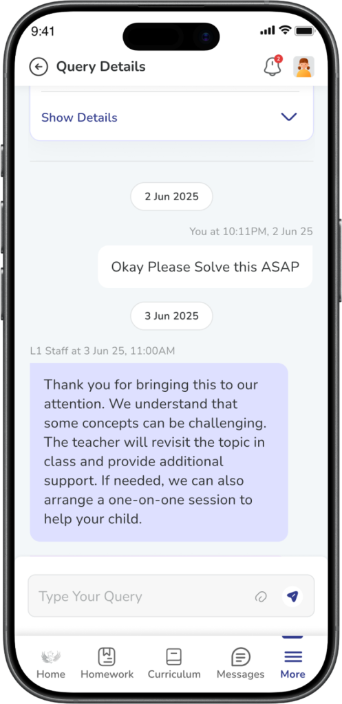 Tap any ticket card from the Parent Connect list. This opens the Query Details page where you can see the full ticket information.