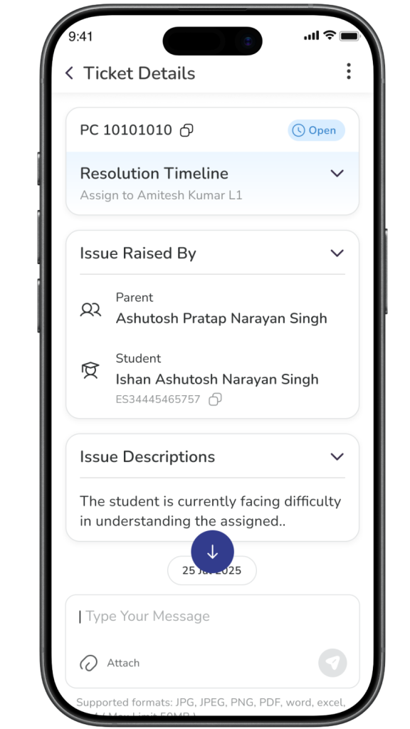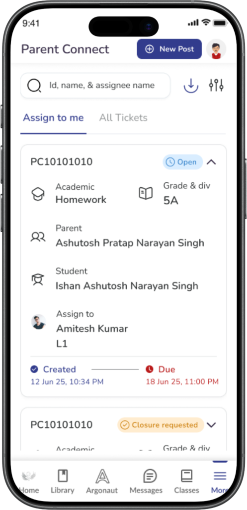 A ticket card may show the ticket ID, category, sub-category, parent name, grade and division, status, and timeline details such as created date and due date.